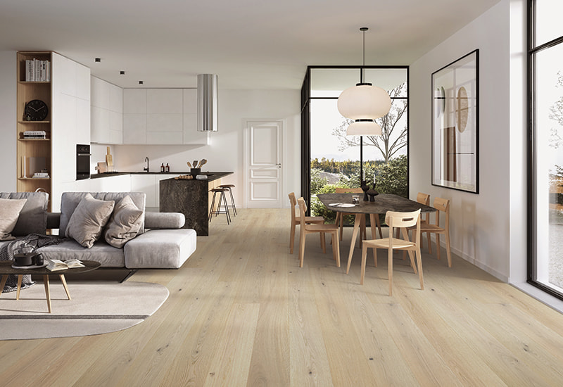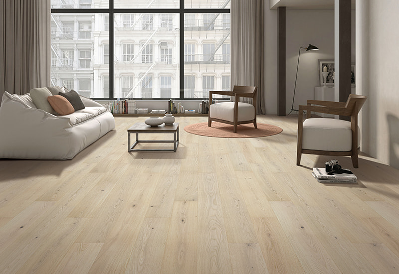 De bleka tonerna i den vita eken skapar en ljus, luftig atmosfär, bra för att förbättra ljus och komplettera en mängd olika inre stilar, från minimalistisk till traditionell. Den bleka finishen belyser också träens naturliga korn och struktur samtidigt som man ger en mjuk, lätt utseende som kan komplettera ett brett utbud av design estetik. UV-lackbeläggning lägger till ett extra skikt av skydd till ytan, vilket gör det motståndskraftigt mot repor, fläckar och blekning över tid. Denna beläggning bevarar träets naturliga skönhet och säkerställer att golvet upprätthåller sitt glans även i hög trafikområden.