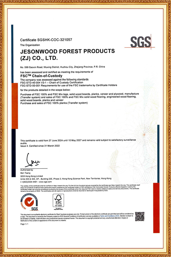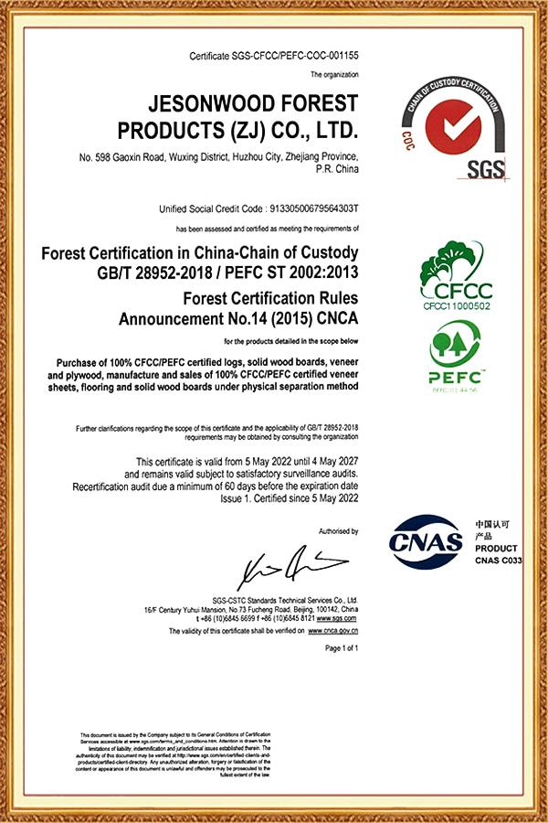 På Jesonwood är varje bit av massivt trägolv utformat ansvarsfullt. Vår inköp överensstämmer med internationella standarder, inklusive FSC, PEFC, JAS och CE -certifieringar. Vi följer också Lacey Act och EUDR för att säkerställa att alla råvaror är lagligt erhållna. Vårt engagemang för miljöansvar innebär att du kan njuta av ditt golv med självförtroende och sinnesfrid.